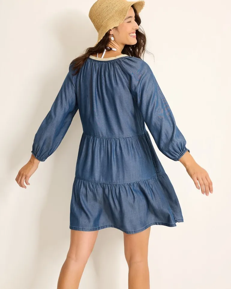Take of-the-moment trends to the shore in this chambray coverup dress, complete with elegant balloon sleeves, a tiered hem, and elevated embroidery along its chic notched neckline.