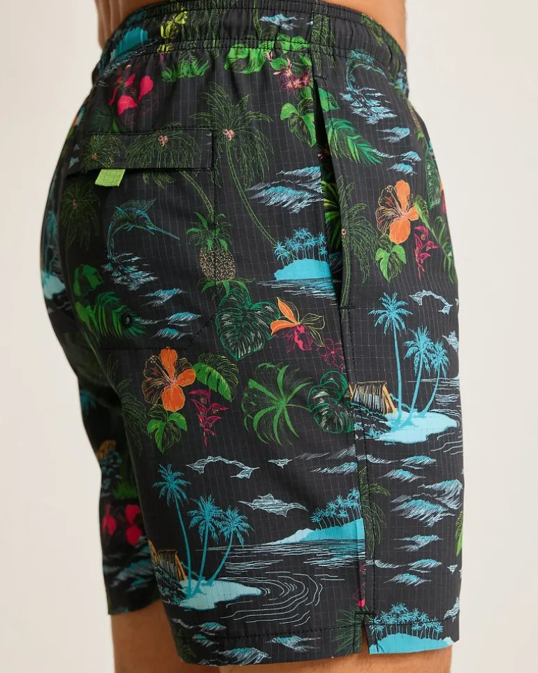 Vibrant tropical motifs make a statement against the stark black background of these beach-ready swim trunks, complete with an internal mesh liner for enhanced comfort.