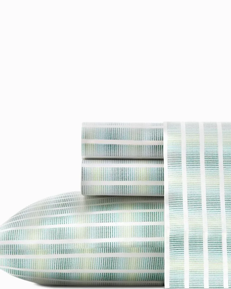 Beachy blues and sea glass greens fade into textured ombré stripes while crisp white lines add a modern edge to these 100% cotton sheets.