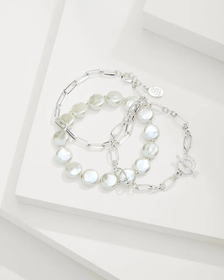 Layered or solo, this set of silver link and pearl stranded bracelets effortlessly brings charm, dimension, and sparkle to your everyday style.