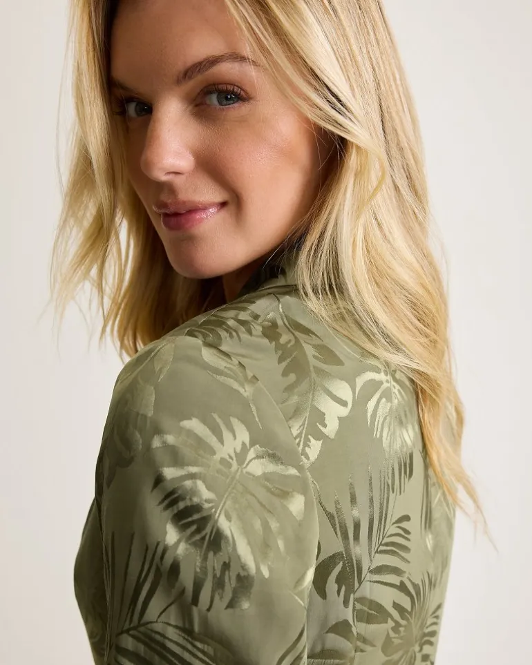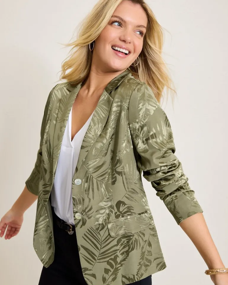 Leaf it to us to create an elegant blazer silhouette that still embraces our tropical spirit. Featuring a satin jacquard monstera print and crafted from a lightweight satin-like blend, this sleek and sophisticated style brings your island state of mind to every sophisticated occasion.