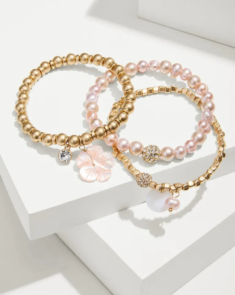 Infuse your look with feminine charm by accessorizing this set of stretch bracelets, featuring pink-hued pearls, copper coated beads, and just enough sparkle.