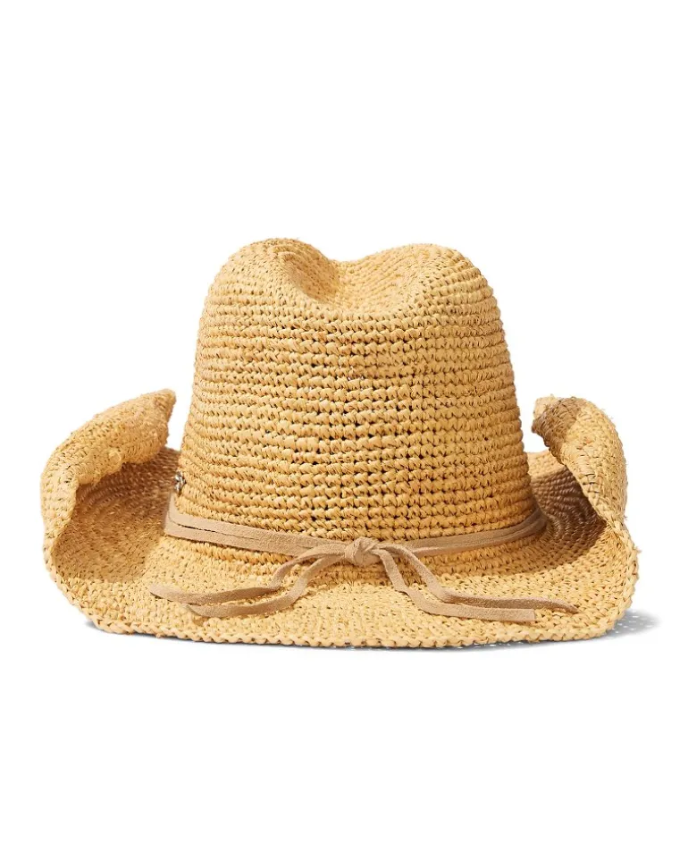 A bohemian twist and a tonal color palette reimagine coastal charm aesthetics in this chic raffia cowboy hat.