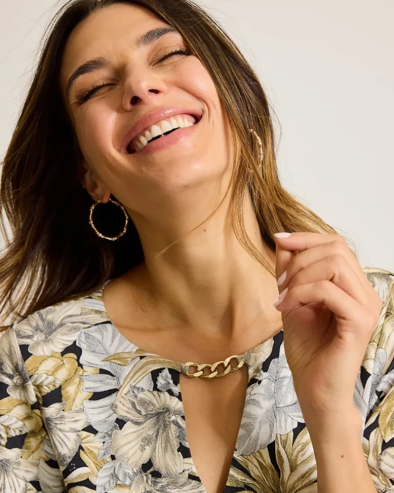 Look-twice details like a chain-embellished neckline and anetched frond print transform a simple silhouette into an unforgettable one. From urban outings to casual get-togethers, this flutter-sleeve dress brings understated elegance to every moment.
