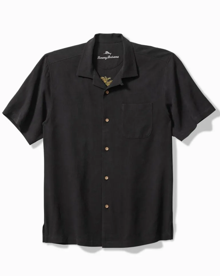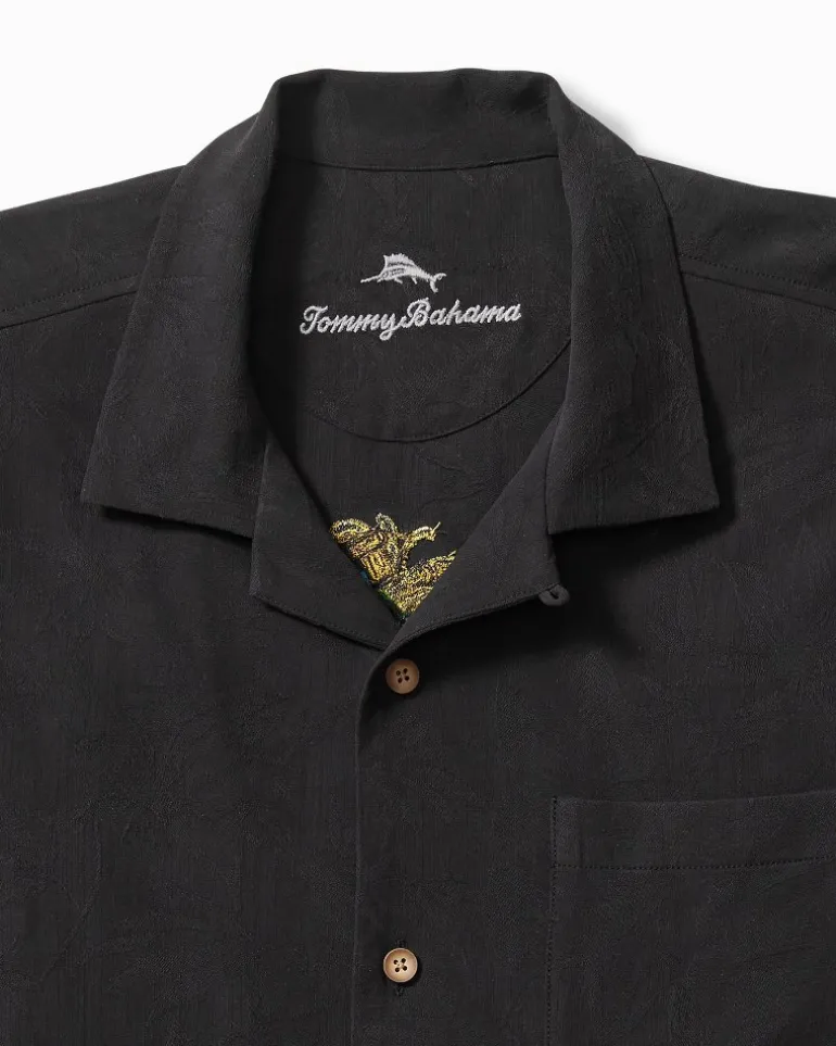 Tis always the season to pop open a bottle of bubbles, when in paradise… Embrace the spirit in this sleek, black silk camp shirt, defined by its cheerful embroidered panelback design that calls for a toast to your stylish flair—and the new year!